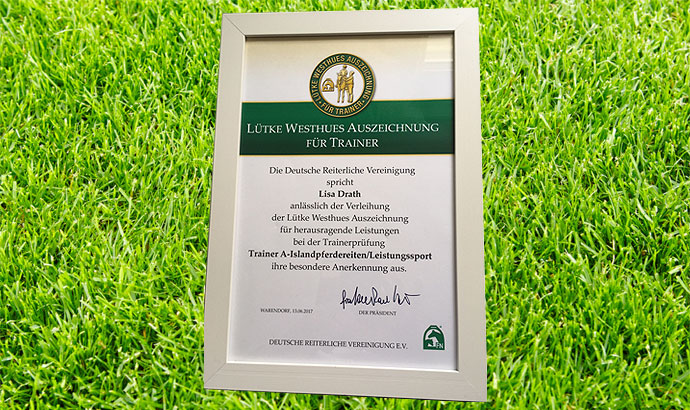 Anlässlich der IPZV-Prüfung zum „Trainer A“ habe ich in dieser Woche von der Deutschen Reiterlichen Vereinigung (FN) in Warendorf die „Lütke-Westhues-Auszeichnung“ erhalten – eine große Ehre mit langer Tradition im Bereich der Ausbildung, über die ich mich wirklich sehr freue. Ganz lieben Dank an unser Gestüt Schloßberg und alle, die mich bei der Trainer- und Bereiter-Ausbildung so tatkräftig unterstützt haben!