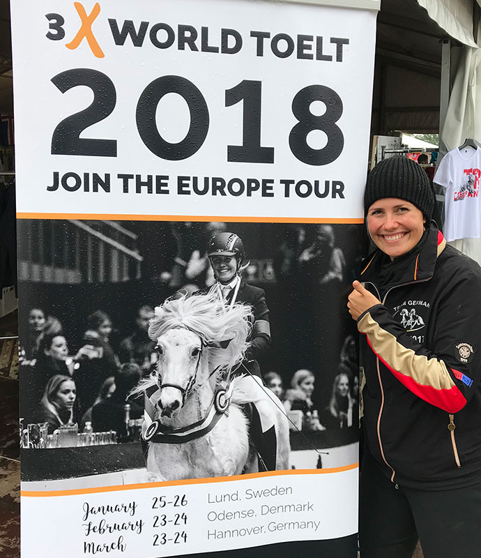 Das war eine tolle Überraschung, als ich an einem der ersten WM-Tage über die an jenem Morgen noch recht regennasse Shopping-Meile von Oirschot bummelte. Auf einmal war da doch tatsächlich mein lieber Kjalar abgebildet – als Werbeträger der 2018er Auflage des WorldTölt, wo wir 2016 und 2017 in Odense jeweils den Viergangpreis gewinnen konnten. Richtig schöne Erinnerungen und gleichzeitig eine gehörige Portion Vorfreude auf den kommenden Winter. Wenn’s dann doch bloß nicht immer so kalt wäre 😉