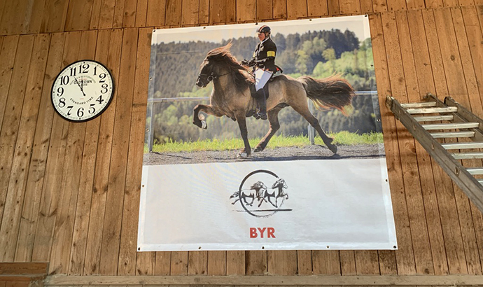 Da war jetzt einfach die Zeit gekommen, fanden wir, dass auch Byr ein schönes Banner-Plätzchen an der Reithallen-Wand bekommen und sich damit zu seinen älteren erfolgreichen Stallkollegen gesellen darf 🙂