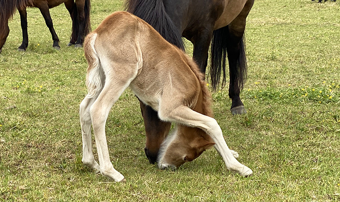 Unser kleines Mädchen haben wir „Óskasól“ getauft – einerseits im Gedenken an ihre tolle Großmutter Ósk frá Klængsseli, die leider seit zwei Jahren nicht mehr lebt, obendrein weil „Ósk“ auf Deutsch „Wunsch“ bedeutet und wir uns nach Gesundheit für Mutter und Kind ein Stutfohlen mit Abzeichen gewünscht hatten und dieser Wunsch nun wahr geworden ist!